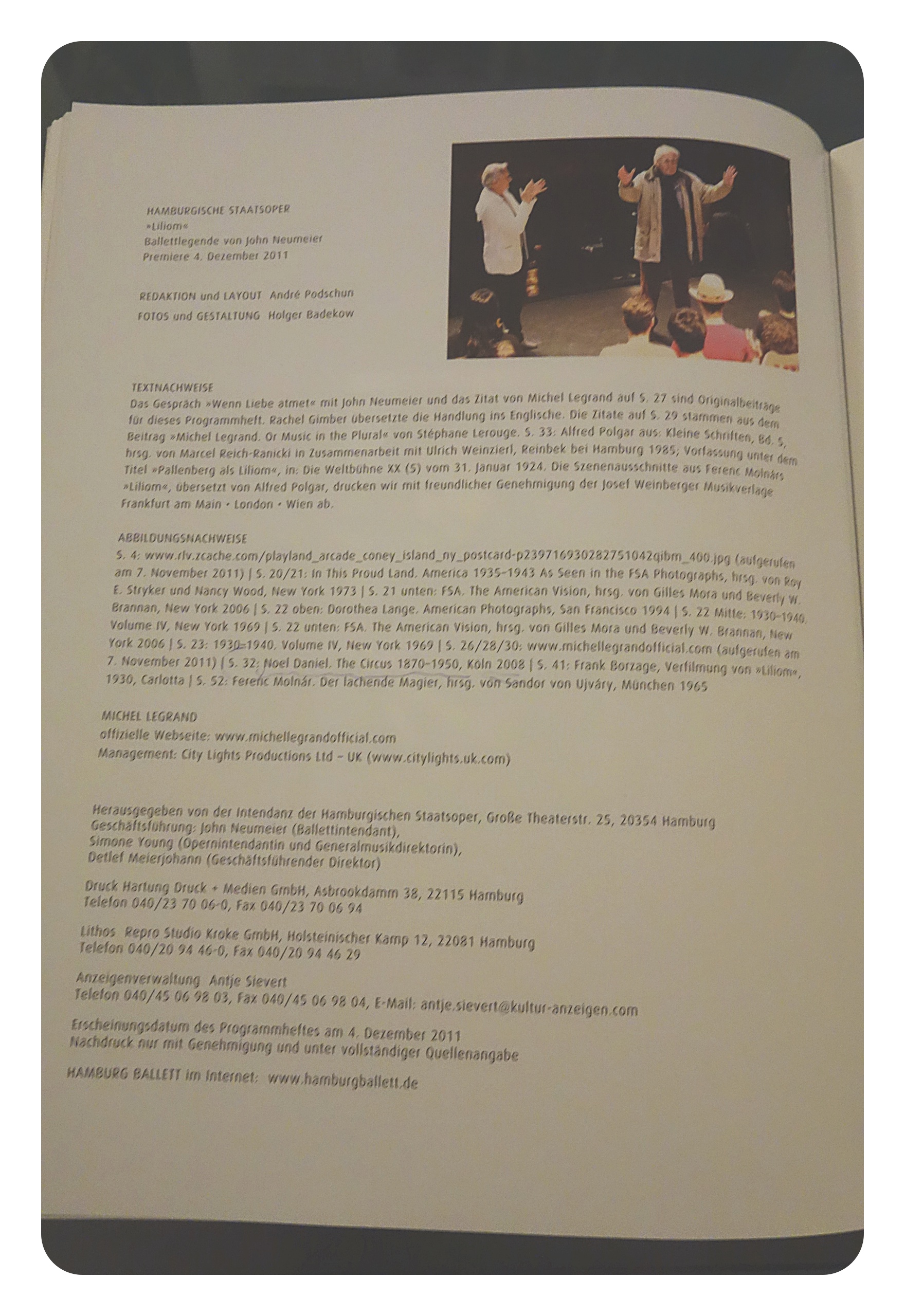 LiliomProgrammImpress- Published 20. Januar 2015 at 1760 × 2560 in Pirouettenwirbel mit Sozialpolitik Ein letzter Blick zurück ins Programmheft von „Liliom“: das Impressum weist die Leistungen aus. Foto: Holger Badekow. Faksimile: Gisela Sonnenburg Programmheft Liliom Impressum ← Previous Next →