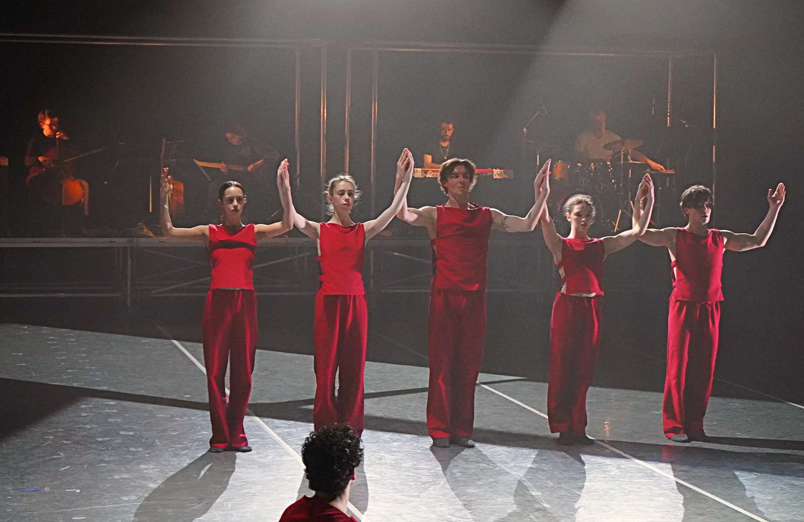 Schließlich versammeln sich die Tänzerinnen und Tänzer vorn in Publikumsnähe am Boden und ziehen an weißen Leinen langsam die beiden Musikertribünen nah an sich heran.