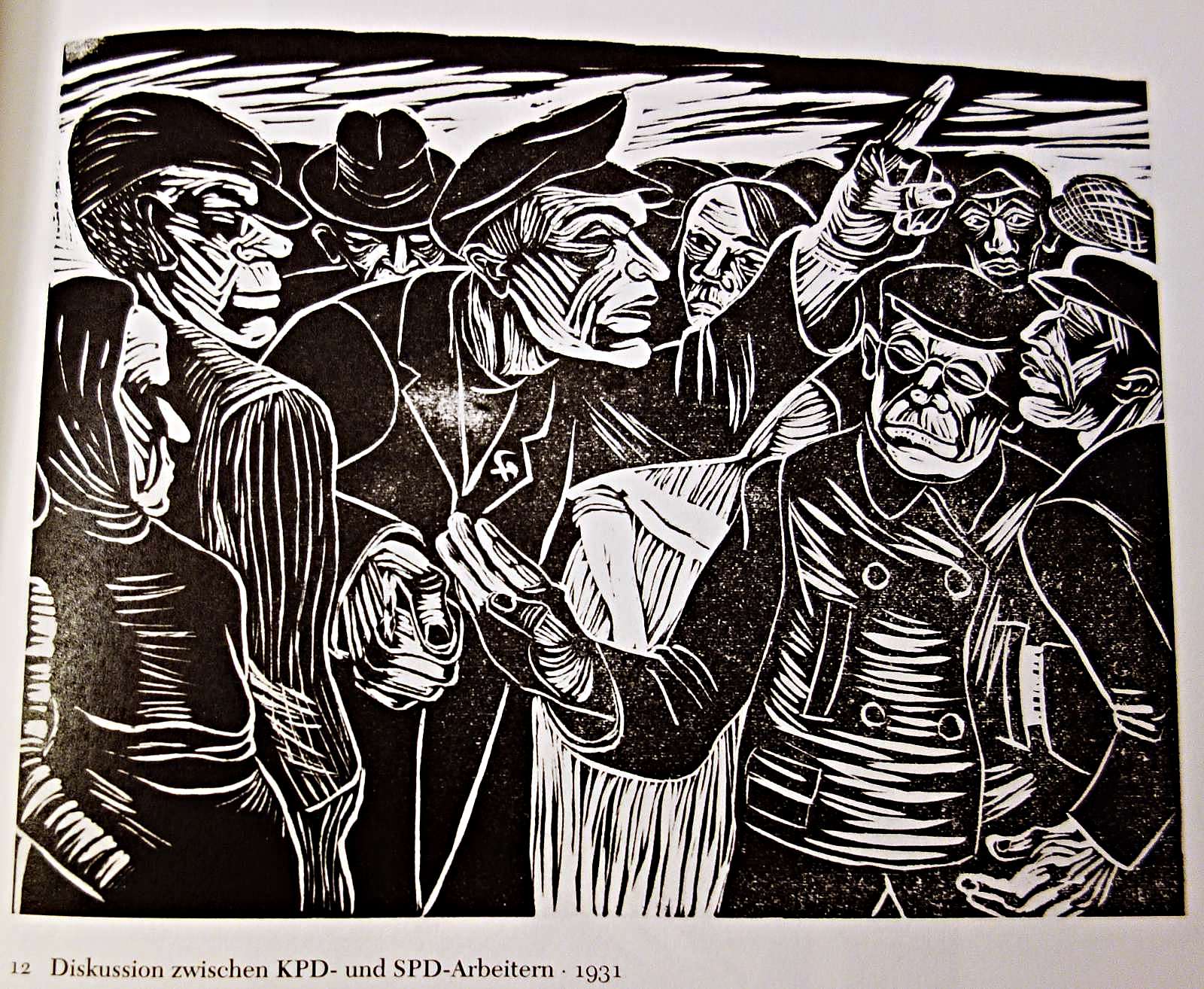 Lea Grundig hielt auf diesem Linolschnitt fest, was Politik machen sollte: nicht aussperren, sondern diskutieren. Die „Diskussion zwischen KPD- und SPD-Arbeitern“ stammt von 1931. Faksimile aus dem Katalog „Lea und Hans Grundig in der Asso“, Hrsg. Maria Heiner, Dresden, 2025 (ISBN 978-3-941209-96-1)