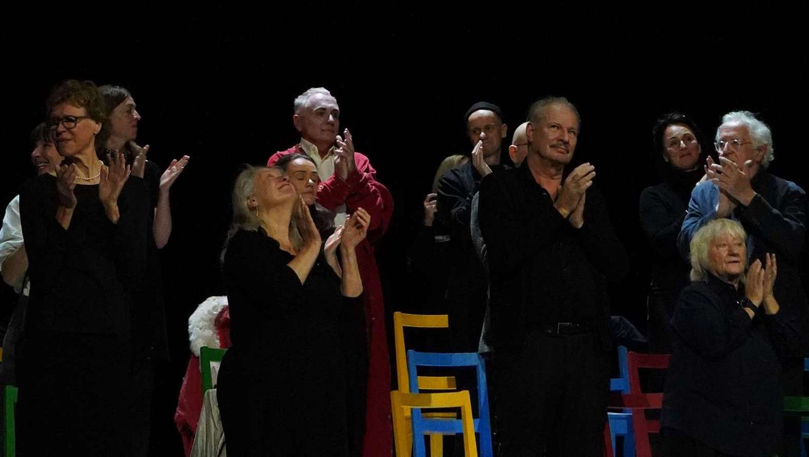 Beim gemeinsamen Schlussapplaus für den König des Theaters, Claus Peymann, gab es Standing Ovations auch auf der Bühne. Ganz rechts vorn: Carmen-Maja Antoni. Foto: Gisela Sonnenburg